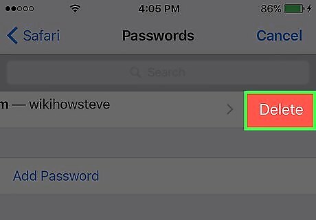 Tap Delete. Safari will no longer retain the login information for that password entry. The next time you try to log into that website, you'll have to enter your username and password credentials. Repeat steps 5 and 6 for any additional passwords you want to remove.