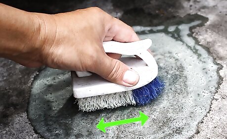 Scrub the area and rinse with clean water. Spray some water onto the spill to moisten it. Use a nylon brush to scrub in the soap. Finish by flushing the area with water.