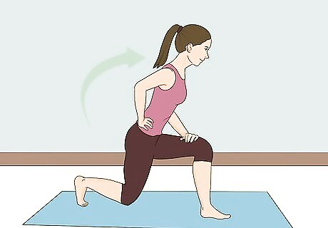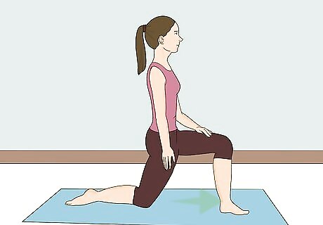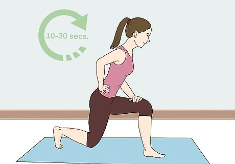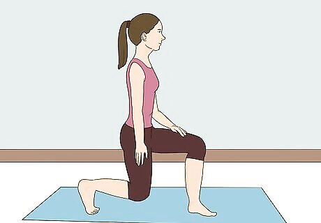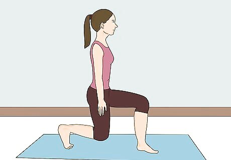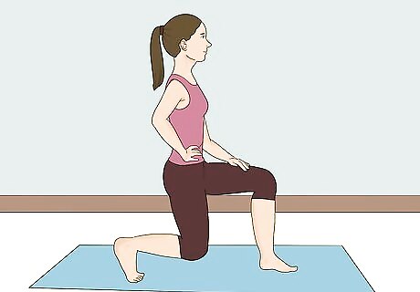 Return to your hands and knees, then stretch on your right leg. Place your palms on the floor to either side of your left foot. Step forward with your right foot while you keep your left knee on the floor. Then, put your right leg in position for the stretch. To recap: Put your right hand on your upper right leg, and your left hand on your left hip. Lean forward on your right leg until you feel mild tension in your hip flexors, but don't extend your right knee past your right foot's toes. Keep your back upright, your shoulders slightly down and back, your chest slightly out, and your abs contracted. Breathe slowly and deeply. Hold the stretch for 10-30 seconds, release it, then repeat 2-3 more times. Always progress through the stretch slowly to gradually increase your range of motion.