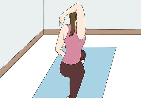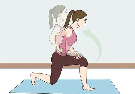 Raise your opposite hand as another way to increase the intensity. As you lean forward on your left leg, for example, raise your right arm straight up in the air. Then, angle it inward over your head very slightly. Stretching your arm upward will add further tension to your hip flexors. Extend your arm upward, but don’t stretch it up so far that you lose your body positioning for the stretch. Keep your back straight, your shoulders slightly back and down, your chest slightly out, and your abs contracted.