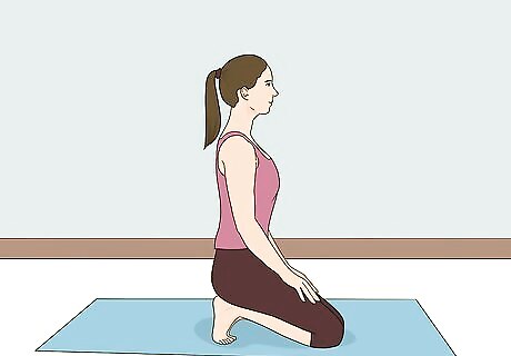 Kneel with both knees on top of an exercise mat. Rest your bottom on your heels, and prop yourself up on your toes on the mat. Keep your back upright and rest your hands on your thighs. If you don’t have an exercise mat, lay out a thick towel instead. It may also help to do the stretch on a soft carpet, mattress, or bed if you have knee problems. There’s no need to hold this position—it simply helps you set your body up properly for the next positioning maneuver. If this starting position is uncomfortable for you, move on as quickly as possible.