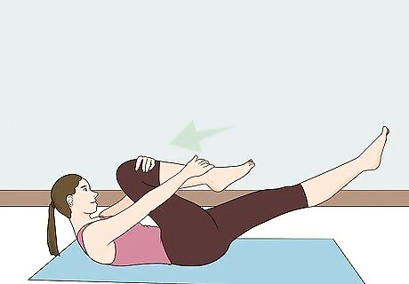 Do an alternate hip flexor stretch if this one is too challenging. For the alternative stretch, start by lying flat on your back on your exercise mat or towel. Use both hands to pull your left knee up to your chest—come as close to touching your chest as possible without causing pain. Then, extend your right foot so that your right calf is flat on the mat (or is as close as possible without pain). This will mildly stretch your right side but not your left. Make sure to stretch both of your legs evenly. Hold this position for 10-30 seconds, and do 3-4 total stretches per leg.