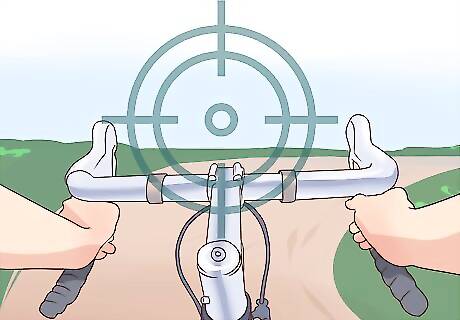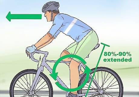Pedal efficiently. Push downward and pull upward with each pedal rotation to get the most power out of your pedal stroke while biking. Make sure your seat is adjusted properly so that when the pedal is all the way down, your leg is between 80 and 90 percent extended. Keep your elbows bent and your arms loose. As you go over bumpy terrain, your arms will act as shock absorbers. Lean forward at about a 45-degree angle and keep your head up. Your eyes should be focused on the road ahead. Don't look over at spectators or at other riders.