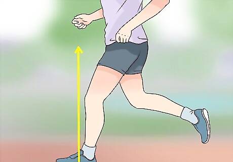 Run with a mid-foot strike. If you hit the ground mid-foot, you can power through your run more efficiently and won't over-extend your legs. A broader stride may cause you to hit the ground with your heels, which will burn precious energy. Your arms should swing forward and back naturally. Avoid clenching your fists or swinging your arms side-to-side, which wastes energy. Keep your stride light. Use your momentum and force of motion to propel your body forward, rather than pounding the ground. Your shoulders should be back, your head straight. Look 20 to 30 feet in front of you so you can anticipate and adjust for other competitors in your way who might cause you to break your stride.