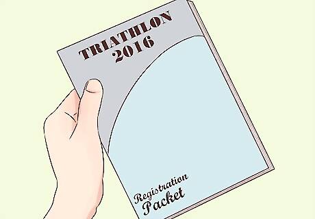 Pick up your registration packet the day before the race. Especially for your first race, take the opportunity to familiarize yourself with the course and talk to the organizers. You'll have more time to do this the day before the race than you will if you wait until the morning of the race. The organizers will provide a basic run-through of the triathlon rules and give you a detailed explanation of the race. You also typically get the opportunity to walk through the course so you can plan your approach and transitions. For example, if you look at the swim-to-bike transition and the start of the biking portion of the triathlon, you'll be able to tell what gear your bike should be in when you start off. After you have a few triathlons under your belt, or if you're running on a course with which you're already familiar, you won't need this additional prep time.