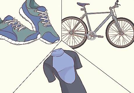 Train in your race gear. Especially for your first few races, don't worry about spending a lot of money on fancy professional-quality race gear. Make sure you have a good pair of running shoes, but for everything else you typically can get away with equipment you already have. For example, for the swimming portion of the triathlon, many pros wear expensive wet suits. However, if you don't have a wet suit, don't feel as though you have to run out and buy one – a regular swimsuit will work just fine. You also don't need a fancy new bike. You can use any bike, and if you already own a bike you're comfortable riding, it's better to use that than to try to break in a new bike in a few short months. During your training, use the same gear you plan to use for the race. This means if you do plan on buying anything new, you should buy it before you start training. If you race with new or different gear than what you trained with, it can throw you off.