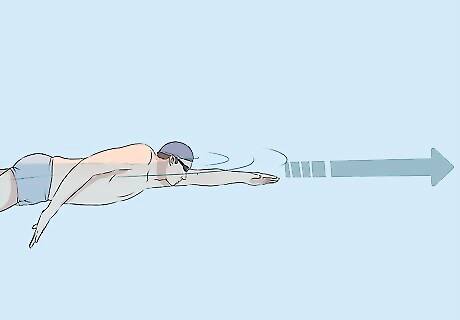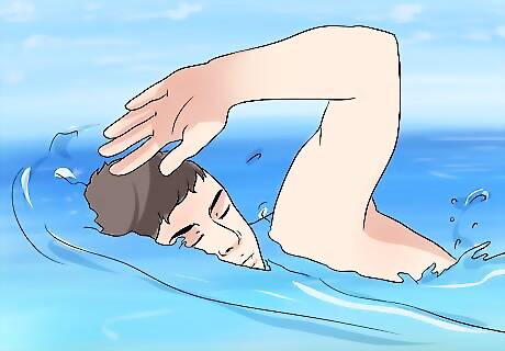 Don't worry about technique. Your strokes should be clean and efficient, but you don't need the most technically proficient stroke, especially if your swim is in open water. Propel yourself forward with long, controlled strokes. Use your training time to improve the form of your stroke and improve your time. During the race itself, replicate your practice swims as much as possible. Swim on your side to elongate your body and get as much force and efficiency as possible out of your stroke. Safety often is more of an issue during the swim leg than the other two legs of the race. Swim in a way that you are comfortable.