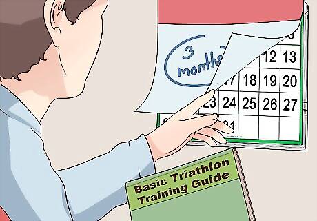 Give yourself three months. Assuming you are reasonably physically fit, you still need two or three months to train specifically for a triathlon. You don't necessarily need a triathlon coach, but you do need a specific workout plan. Check listings to find races taking place near you, and sign up for one that is at least two or three months away. That will give you time to train. For your first race, try to find one as close to you as possible. Traveling to another location for the race is an additional element that you don't want to worry about your first time out. Find a basic triathlon training guide and do the workouts yourself. If you think your form or technique needs to be adjusted, get advice from a trainer or coach. They can help you get started on the right track and teach you the proper form which can prevent injuries.