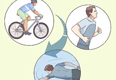Keep your bike in control. Don't get so hung up on the racing aspect that you forget the rules of the road. Riding a bike by yourself during training is significantly different than riding with a large group of competitors. Maintaining focus on the road in front of you is the best way to avoid a possible collision. Don't just look immediately in front of you, but also further afield so you can anticipate possible problems and adjust before things get too tight. Ride on the right-hand side of the road. If you need to pass a slower competitor, shout "on your left" to them before you pass. Keep in mind that all competitors are tired, nervous, and full of adrenaline from excitement over the race. The best way to avoid a collision is to maintain control at all times.