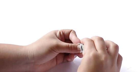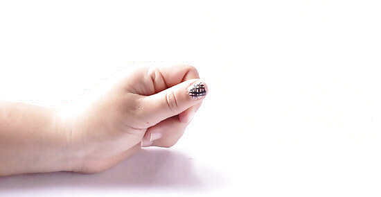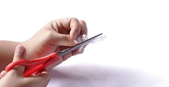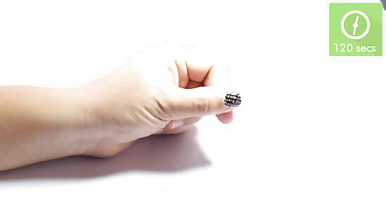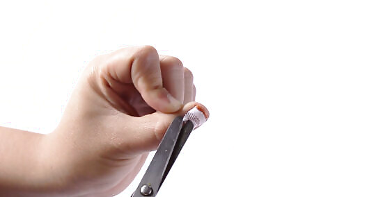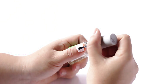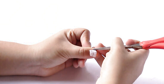 Clean up any overhanging fabric with small scissors. Let your polish dry first. Then use the point of the scissors to carefully snip off any bits of thread around the edges of your nail.