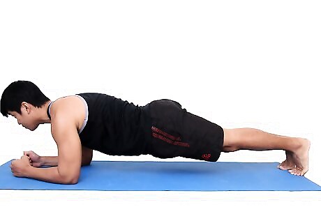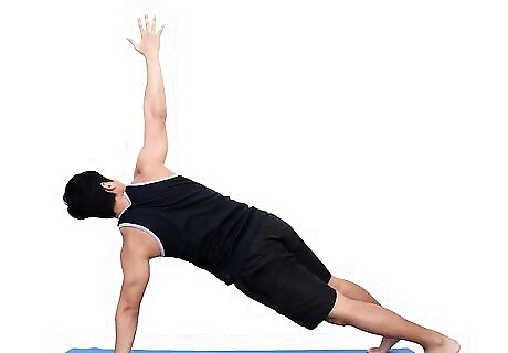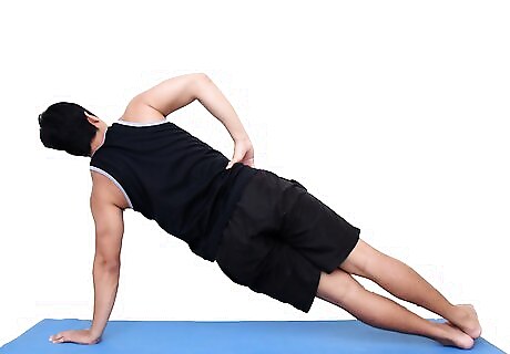 Engage in the side plank. Begin by lying on your right side and supporting yourself with your right forearm, with your elbow planted at the side. Raise your hips so that they are in a straight line with your head. Alternate different sides.