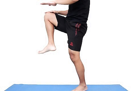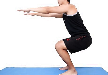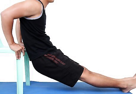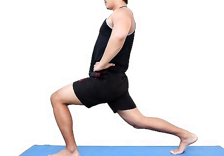 Perform lunges. Position yourself forward with one foot in front, with knees bent and the other foot back. Keep your feet flat on the floor. Alternate feet patterns. This exercise is popular among athletes.