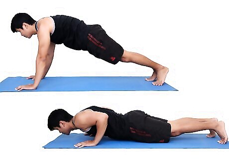 Do push ups. Formally known as press ups, this is an exercise where you lie on the floor with a straight back and raise your body up and down. It is great for benefitting your shoulder and chest muscles.