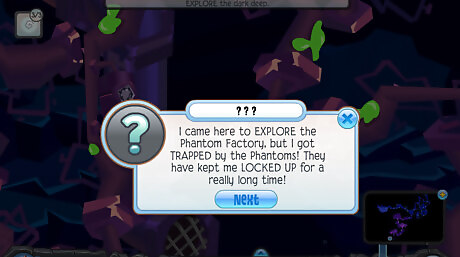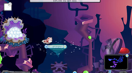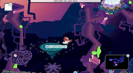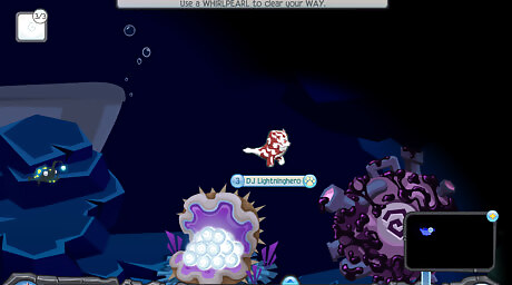 Explore the deep. You'll enter a large, dark area with only a small range of light circling around your animal wherever you move. When you move right near the very top of the area, brushing up against a rock wall, you'll encounter a large whale who will tell you about the phantom factory. Right in front of this whale will be a clam full of whirlpearls, which are the underwater equivalent of boomseeds. Grab one to destroy the phantom blockage right beside the clam. If you move from where you exit the pipe to the top left, you'll find a chest full of 100 gems in hard mode. Screen Shot 2020 02 12 at 10.32.51 PM.png