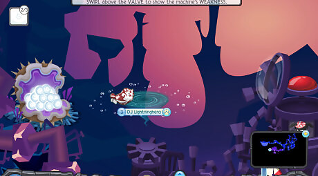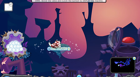 Find the machine's stop valve. Go all the way to the left, beside a clam full of pearls, and you'll find a valve that must be swirled over so you can locate the machine's weakness. Swirl above it to do so. A red button will begin to become more and more exposed.