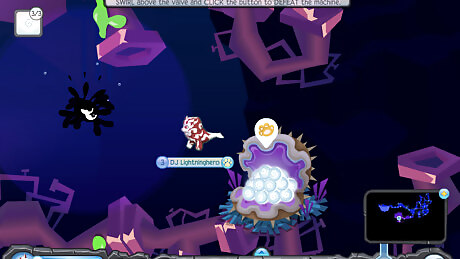 Head down. Once the machine is disabled, you will be allowed passage below deeper into the water. Encounter two phantoms and destroy them. Once again, you'll find another machine. Deal with two more phantoms. Head near the bottom right to find its weakness. Swirl over the valve and once again, repeat the process of scratching at the button several times while destroying the phantoms around you. Each time that you unlock the button, it will require more and more damage. For reference, each time you unlock the button of one machine, you have to drop one whirlpearl on it and scratch it a little bit. Repeat this process for the third and final machine.