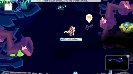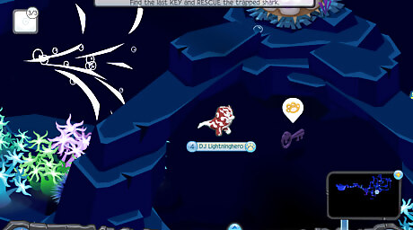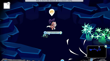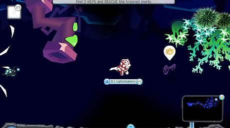 Find the first key. Move up right from where the sharks are through the patch of seaweed. Head up and move through the current moving up. A phantom spawner will be above you - destroy the two phantoms that spawn out of it. Go up and destroy the phantom obstacle in your way. Go up and destroy the phantoms. If you go up slightly more, you'll find the first key. To get back to the sharks, go through the current right. Go down and destroy the two phantoms. Go down and then through the current left. Go through the seaweed patch and free a shark. Screen Shot 2020 02 16 at 5.53.15 PM.png The first key may be in another area. As soon as you move up right from where the sharks are, you'll find it. To get back, simply go through the patch of seaweed. Screen Shot 2020 02 16 at 6.41.04 PM.png