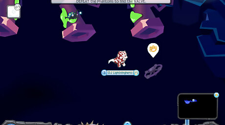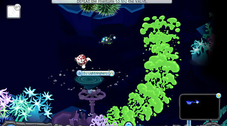 Enter the lit area and destroy the phantoms. Move right through the seaweed patch. When you move up, you'll find three phantom tubes that will spawn phantoms, like phantom sprouters on land. However, unlike phantom sprouters, these phantoms won't automatically chase you no matter where you are which provides an advantage. Destroy the phantoms that spawn out of the tubes with as many whirlpearls as needed. You can also destroy phantoms from the seaweed patch if you want. You'll need to destroy a total of 9 phantoms. When you destroy the last phantom, it will drop a valve. Grab it and head right.