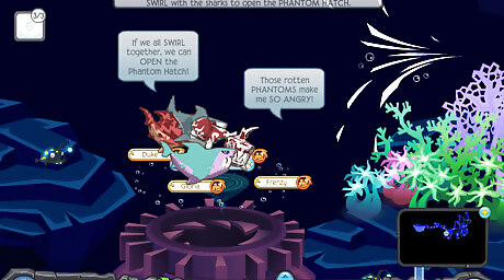 Open the phantom hatch. Head down and swirl over the phantom hatch along with the sharks. The more players with you in the adventure swirling, the faster it will open. Once it opens, head down into it.