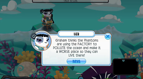Speak to Liza. She'll tell you that the phantom factory is a way for the phantoms to pollute the water to turn it into a place that the phantoms can infest and live in. She will then tell you to infiltrate the factory and disappear. Then enter the secret pipe below your animal.
