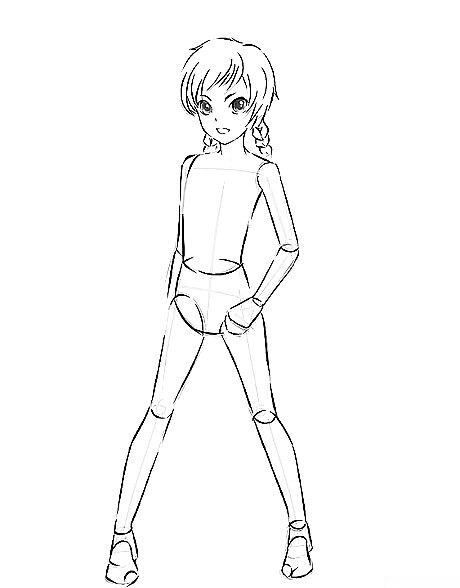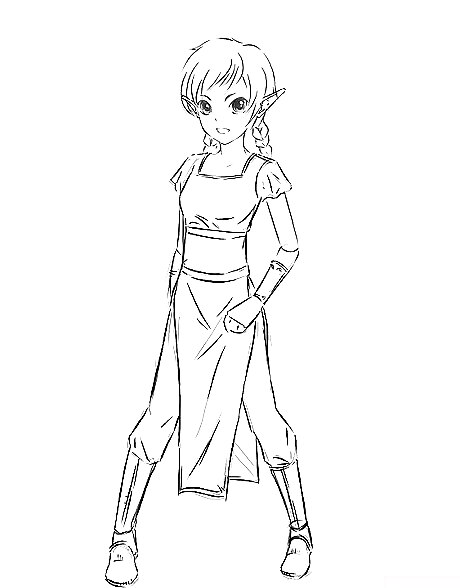 Draw the basic outline for the female elf shape. Follow the guidance shown in this image, focusing in particular on: Creating a lithe and fine body structure; convey a smallish and slim size A fine and pointed face and head A strong but equally dainty stance.