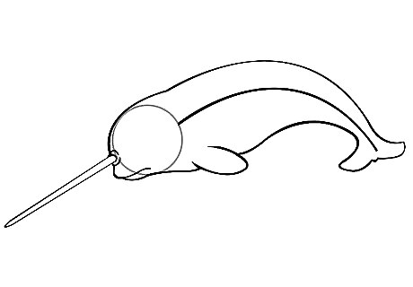 Draw the basic steps of the narwhal. Draw a circle for the face. Then, add the body line. Also add the horn.