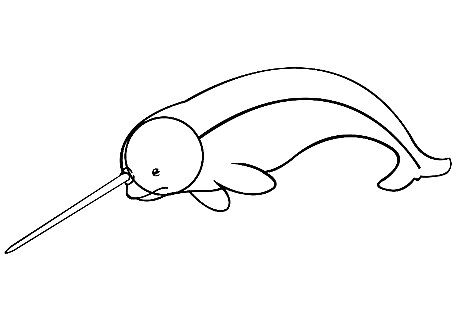 Draw the torso of the narwhal. Draw his mouth, his belly, His tail and flipper. Don't forget the outline of the horn.