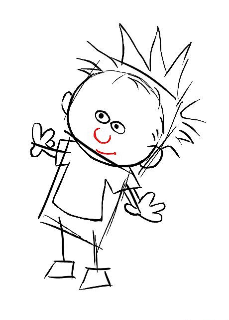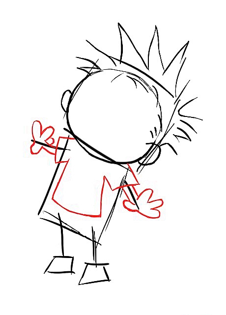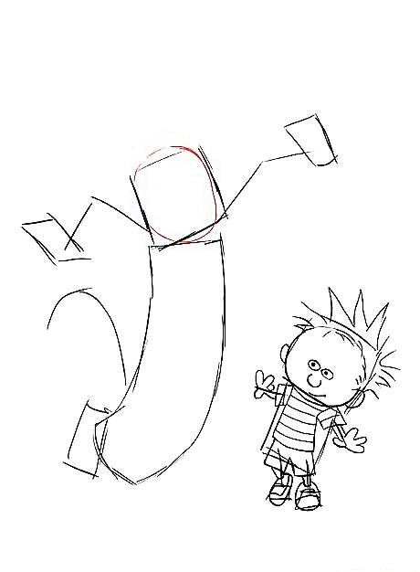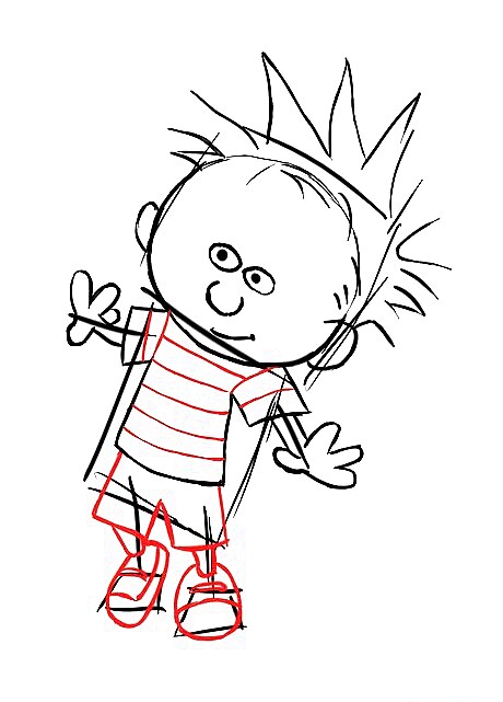 Define Calvin's clothing by making horizontal stripes on his shirt (his typical attire, though it varies), and putting legs on his trousers, which are usually black. You can exaggerate the size of his shoes, which appear to be almost directly connected to his butt, since his legs are disproportionately short.