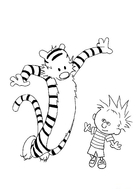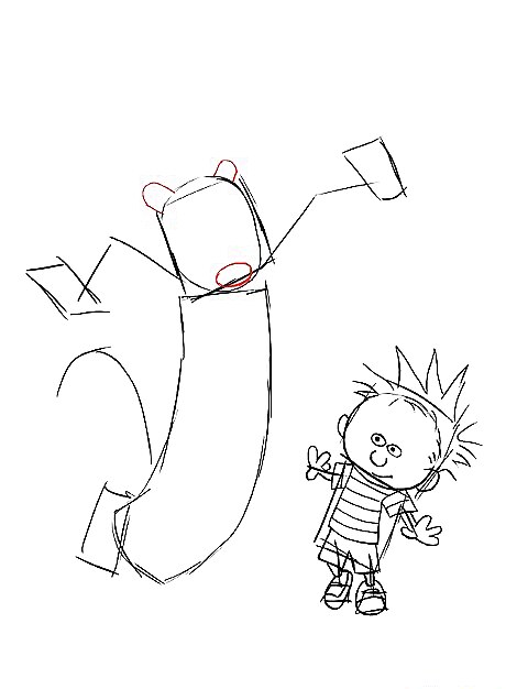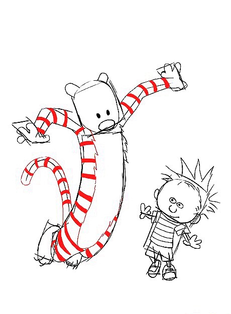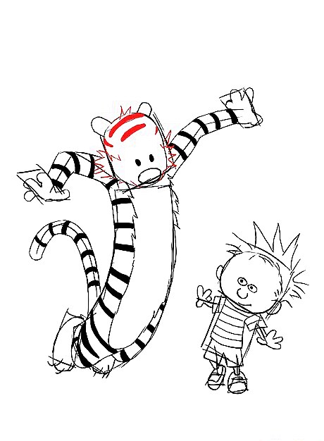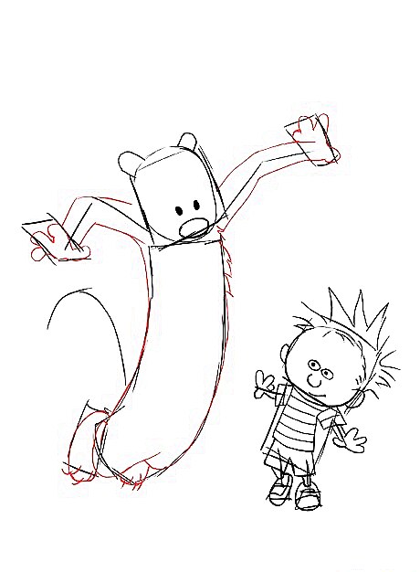 Erase the sketch lines and use extreme expressions on both Calvin and Hobbes, since they are very emotional characters. Place them in ferocious (or frightened) poses. These are two cartoon characters who are seldom found idling away an afternoon.