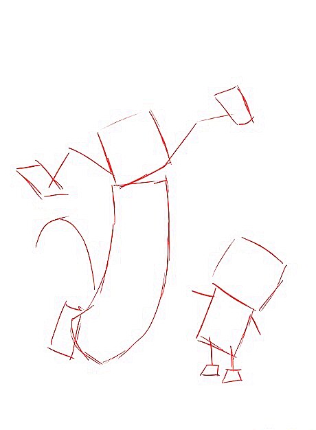 Draw two parallel vertical lines for the trunk portion of his body, with stubby arms and legs. Defining individual fingers and toes is not needed, since we are drawing cartoon characters.