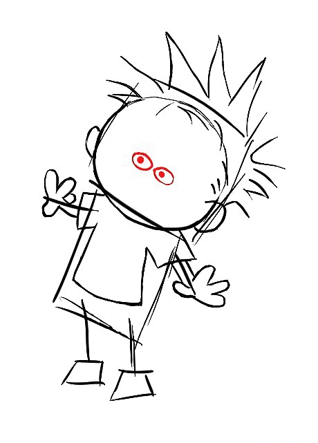 Place two small, black circles (his beady little eyes) closely spaced just below the center of the oval which you have drawn for his head.