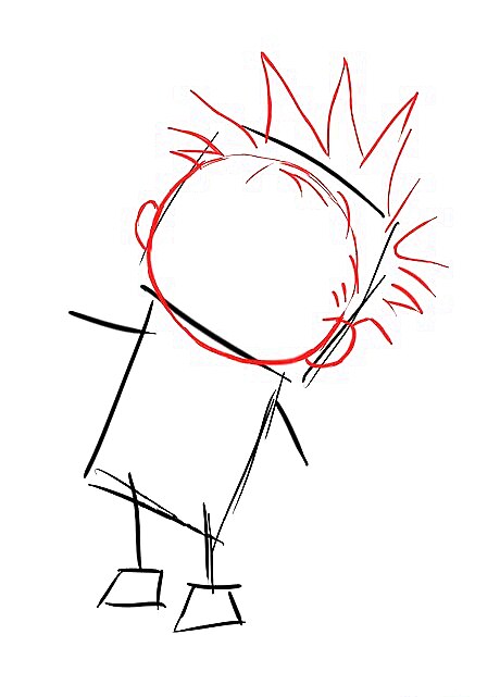 Add more distinct shapes. Draw a rough circular shape for Calvin's head, making sure the line across the top is very light, since when you make the slash like lines for his hair, this guideline will be erased or drawn over.