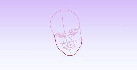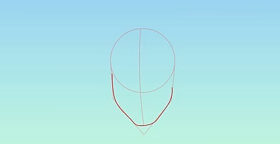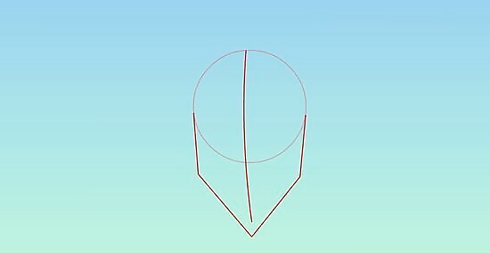 Create a slightly curved vertical bisecting line extending out of the circle as an axis to the facial features. Make a ‘V’ shape at the base of the above line and join the two ends of it to the edges of the circle as guides to the jaw and the chin.