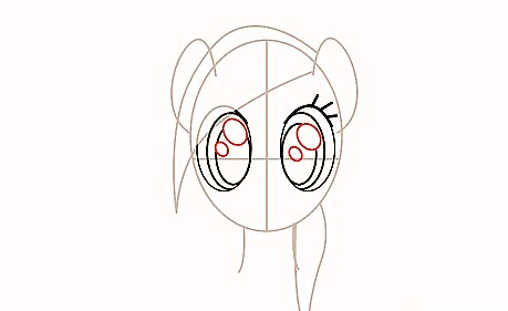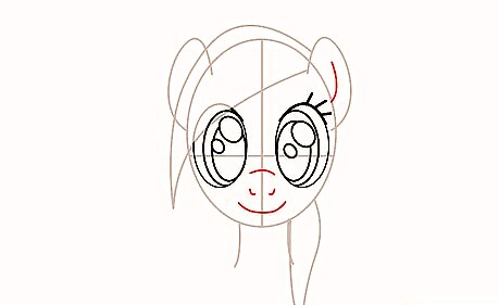 Draw the light's reflection on the eyes using two small oblongs, one smaller than the other. Add a slanted line at the center of the ear.