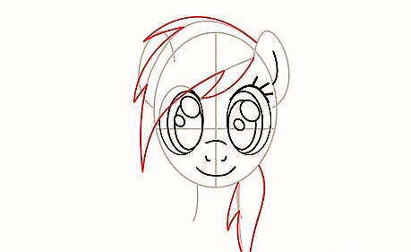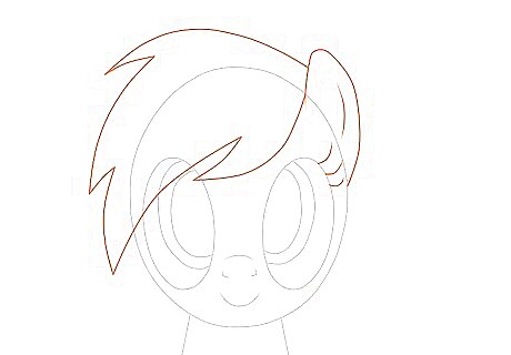 Draw the hair of Rainbow Dash which is directed to the left – use simple curves and strokes. Draw also the right ear which is visible using curves.