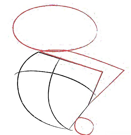 Add hair. Create an upside down checkmark and two round shapes. Place the larger round shape on top of her head and the smaller one the right side of her face.