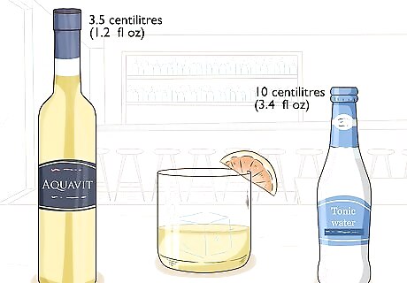 Use aquavit to try new take on a gin and tonic. Change up this classic beverage by switching out gin for 3.5 centilitres (1.2 fl oz) of aquavit. Mix the liquor with 10 centilitres (3.4 fl oz) of tonic, and pour the mixture over a glass filled with ice. To add some extra fruity flavor this drink, try adding a grapefruit wedge. This slice can be placed in the center of the glass.