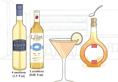 Whip up a martini with aquavit, Lillet Blanc, and orange curaçao. Mix 4 centilitres (1.4 fl oz) of aquavit with 2 centilitres (0.68 fl oz) of Lillet Blanc, a sweet wine. Stir both ingredients together until they’re thoroughly mixed. Next, stir in a spoonful of orange curaçao to add a hint of fruity flavor to the cocktail. Pour this mixture into a martini glass filled with ice. If you’d like to garnish this drink, place a small slice of lemon on the rim of the glass.