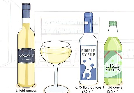 Combine lime juice, syrup, and aquavit to make a Scandinavian daiquiri. Mix 2 fluid ounces (5.9 cL) of aquavit, 1 fluid ounce (3.0 cL) of lime juice, and 0.75 fluid ounces (2.2 cL) of sugar syrup together in a shaker filled with ice. Continue shaking for a few seconds, or until all of the ingredients are mixed together thoroughly. Strain this drink into a normal-sized glass before serving. To make this drink extra decorative, place a whole star anise in the center of the beverage. Try chilling the glass ahead of time to make the drink extra refreshing.
