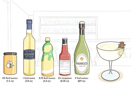 Concoct a holiday beverage with honey syrup, lemon juice, prosecco, and aquavit. Add 1 fluid ounce (3.0 cL) of aquavit, 0.5 fluid ounces (1.5 cL) of honey syrup, 0.75 fluid ounces (2.2 cL) of lemon juice, and 0.4 teaspoons (0.20 cL) of bitters shaker filled with ice. Mix the ingredients together thoroughly before pouring them into a coupe glass. Finally, pour 3 fluid ounces (8.9 cL) of prosecco over the beverage. Before serving the drink, consider leaving the coupe glass in the refrigerator. A twist of lemon rind and a whole star anise work great as garnishes for this cocktail.