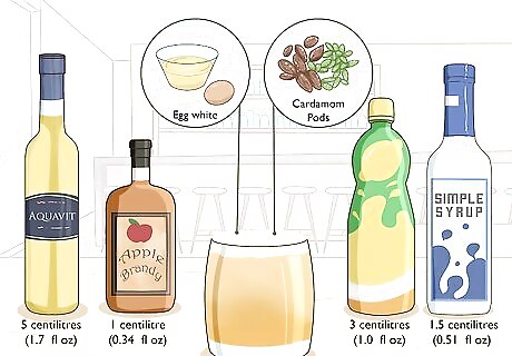 Make a sour jubilee by mixing aquavit, brandy, and lemon juice together. Start by stirring 5 centilitres (1.7 fl oz) of aquavit, 1 centilitre (0.34 fl oz) of apple brandy, 3 centilitres (1.0 fl oz) of lemon juice, and 1.5 centilitres (0.51 fl oz) of sugar syrup in a separate mixer that’s filled with ice. Add 2 to 3 teaspoons (0.99 to 1.48 cL) of egg white and a single cardamom pod to the mixture to give it a little extra flavor. Strain the drink twice before serving it on a rock of ice. Feel free to add a leaf of cilantro as a garnish.