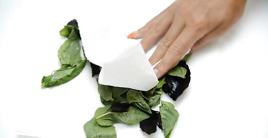 Let the leaves dry off after rinsing them. You can either let the basil air dry or gently pat it dry with a towel. Wait until the leaves have dried off completely before putting them in the oven, or they will cook instead of dry out. If you like, you can also gently roll the leaves up in a clean towel for a few minutes to absorb excess moisture.