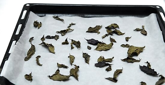 Bake the leaves for 2-4 hours. Put the baking sheet in the oven on the top rack. Check the leaves frequently (e.g., every 15 minutes), especially as you approach the 2-hour mark, and turn them over occasionally with tongs to help them dry more evenly. The leaves are done when you can crumble them easily.