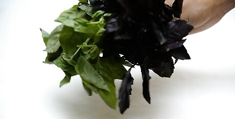 Harvest no more than a third of the plant. If you harvest your basil leaves from the garden instead of buying them from the store, wait until the plant is 6–8 inches (15–20 cm) tall before you start picking any leaves. You can either pick off the leaves individually or cut off a whole stem, but make sure to harvest from the top down. Cut back no more than the top one third of the plant. If you choose to cut off the top of the plant, you’ll need to wait a few weeks before it’s ready to harvest again.