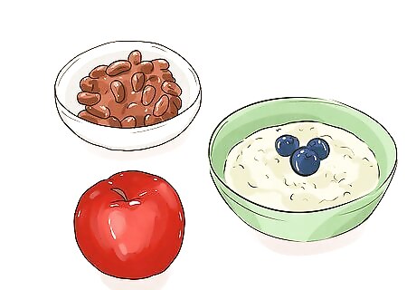 Eat high-fiber whole foods like oatmeal, kidney beans, and apples. These all contain soluble fiber which reduces your “bad” cholesterol or low-density lipoprotein (LDL) by making it more difficult for your blood to absorb cholesterol. Aim for 10 grams of soluble fiber each day. Try fiber-rich fruits like bananas, apples, pears, and prunes. A cup and a half of oatmeal will provide you with 6 grams of fiber and is an easy breakfast option.