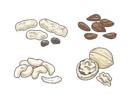 Eat a handful of nuts each day. Almonds, walnuts, and other tree nuts are high in mono- and polyunsaturated fatty acids and work to keep your blood vessels healthy. They can also improve blood cholesterol. A handful is about 1.5 ounces or 42.5 grams. Don’t eat nuts that are covered in salt, flavorings, or sugar. These will add empty calories and unnecessary salt and sugar to your diet.
