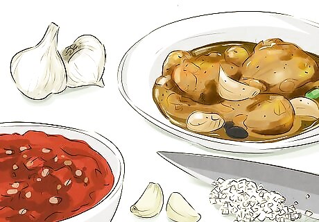 Add garlic to recipes. Not only has garlic been shown to reduce cholesterol, it also helps to prevent blood clots, reduce blood pressure and acts as a natural antibiotic. Add minced, pureed, or chopped fresh garlic to your dish — try to include 1/2 to one full clove daily. Dried garlic powder will also do the trick. While garlic can significantly lower total cholesterol, LDL cholesterol, and triglycerides, the effects do not last long-term if you stop using it. Consider it a complimentary treatment to eating a balanced diet of whole foods.