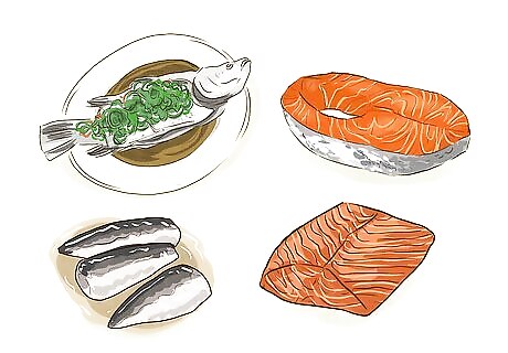 Eat fatty fish at least twice a week. Fatty fish are rich in omega-3s which have been shown to lower triglycerides. Salmon, tuna, trout, herring, sardines, and mackerel are good choices. The American Heart Association recommends all adults eat at least two servings per week. A filet of black cod, also known as sablefish, can be grilled, broiled, or seared for a quick and easy dinner. If you eat freshwater fish caught locally by friends, family, or other anglers, be sure to heed local advisories about how much fish is safe to consume. These fish can sometimes contain high levels of heavy metals like mercury.