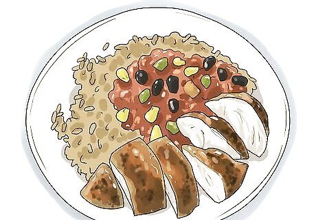 Cook meals at home based on whole foods. Whenever possible, cook your own meals or eat foods you have previously prepared at home. This will give you control over the ingredients and allow you to make healthy food choices. Prepare foods ahead of time like chopped raw vegetables, grilled chicken breasts, or brown rice. These can easily be turned into a variety of whole foods-based meals during the week. Try making rice bowls for an easy weeknight dinner. Top bowls of brown rice with your favorite meats, vegetables, and seasonings. Try brown rice topped with grilled chicken, black beans, veggies and salsa. You can even make the rice and grill the chicken ahead of time.