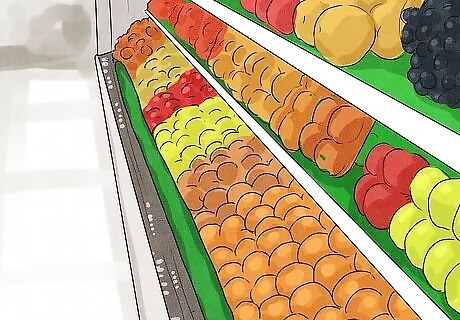 Shop the outer perimeter of the grocery store. The outer edges of the grocery store usually contain the whole foods we need for a healthy diet including meats, fruits, and vegetables. Staying away from aisles containing processed foods will limit temptation to buy processed foods. Stick to sections containing the nutrient-dense whole foods needed for a healthy diet, like the produce and meat departments. Avoid aisles that contain items like frozen meals, potato chips, or soda.